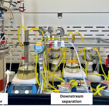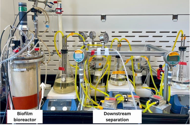 We design and implement innovative bioreactor systems to transform abundant yet often underutilized waste, such as brewery wastewater, dairy runoff, food waste, and lignocellulosic biomass, into economically viable, high-value products, including carboxylic acids and alcohols. One example is a biofilm bioreactor, which utilizes inexpensive support material to develop and enrich the biofilm microbial community, enabling simultaneous filtration and biofilm-enabled microbial conversion.